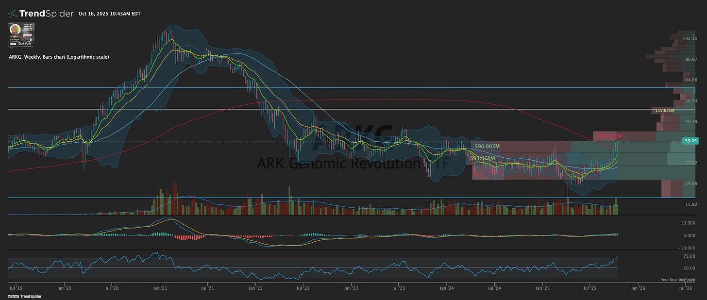 The one that’s up almost 20% is ARKG 0.00%↑ . This ETF with biotech stocks were surging early in the month and I discovered the trend and gave folks 3 ETFs. This is up close to 20% and the other ETF’s are up 10% and 7%.
