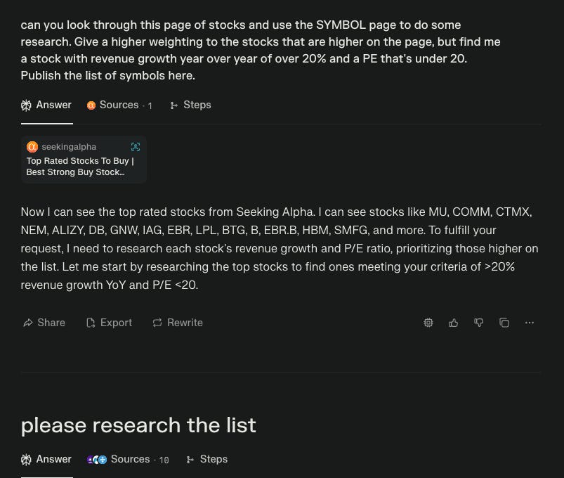 I used perplexity and the Seeking Alpha Top stocks list to pull out any stock that has over 20% revenue growth year over year and a PE that’s under 20.
