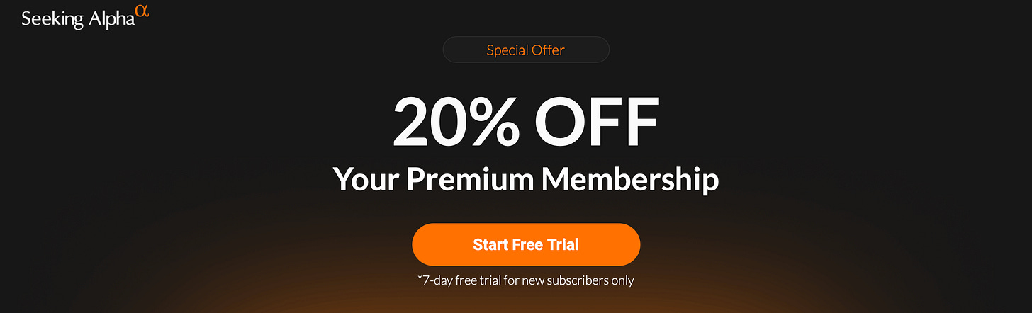 Alpha Picks - get 30 days of Seeking Alpha Premium when you sign up for Alpha Picks this weekend. Seeking Alpha Premium is a separate subscription, but this gives you the opportunity to fully evaluate the Alpha Picks portfolio using all the Seeking Alpha Premium tools and analysis. That’s a big savings and a way to try out both services.