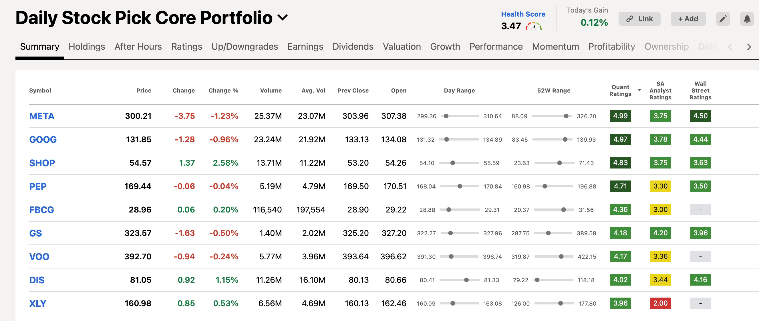 It doesn’t automatically mean these stocks stay in the Core Portfolio, but you’ll see a SA Analyst rating and a Wall Street rating. Between all 3 of these and research I can make an educated guess as to which stocks I want to own vs. those I don’t.