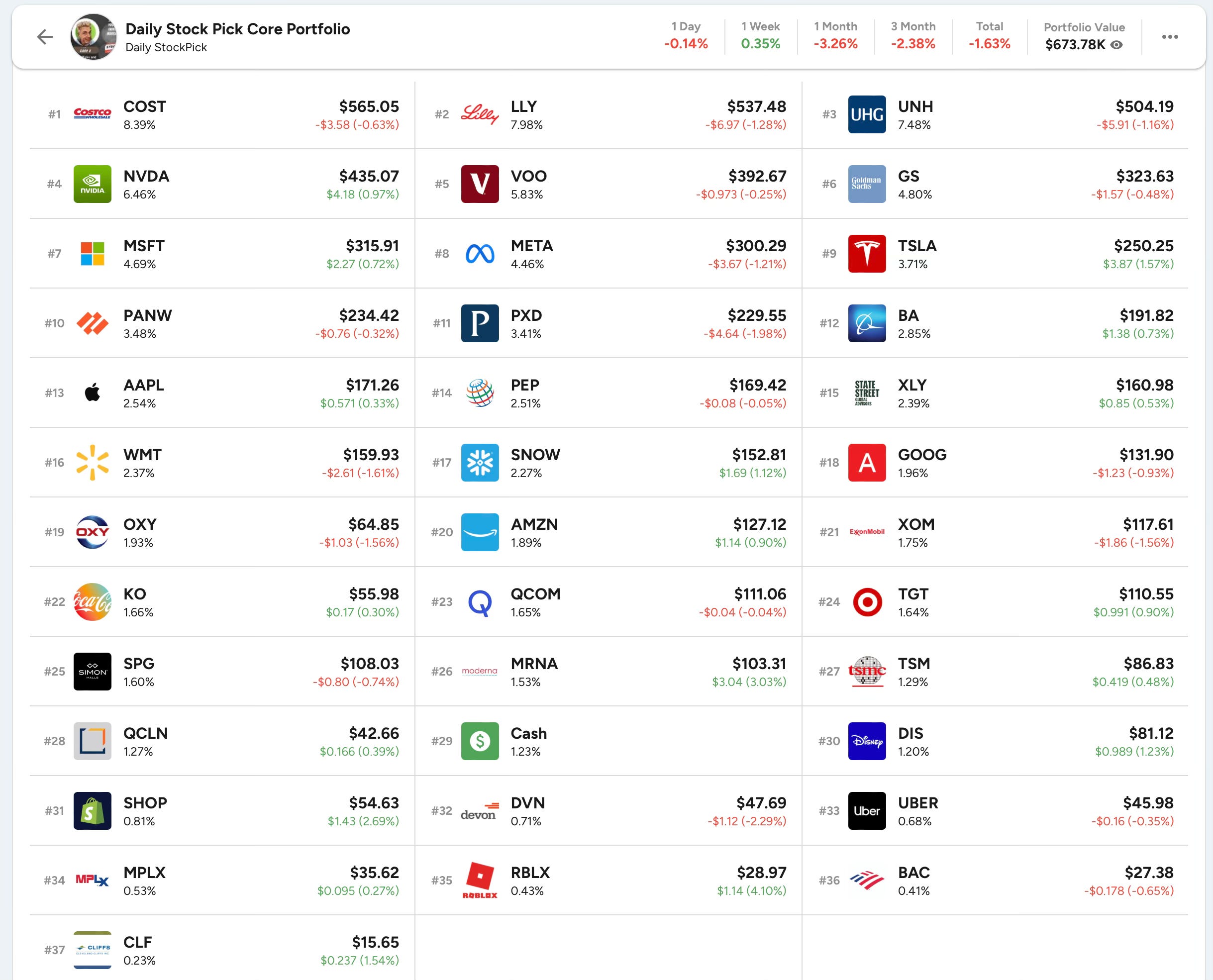 The reason I’m not rebalancing the Core Portfolio here is because it’s equal weighted - just 100 stocks of each stock. That’s why COST is the largest position - it’s the highest share price at the time of purchase.